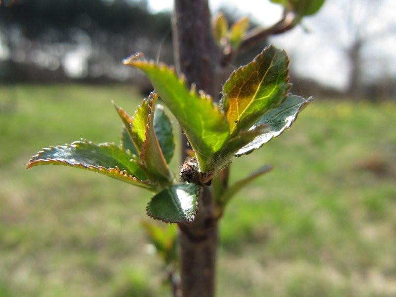 Der gestrige Star. Immer wenn ich in den Zweitgarten komme, gilt diesem Bäumchen einer der ersten Wege. Es hat sich prächtig entwickelt und ist gut in Draht gebettet sehr vital durch den Winter gekommen (steht völlig frei). Jetzt treibt es schon kräftig aus: Malus sikkimensis, aus Samen gezogen.