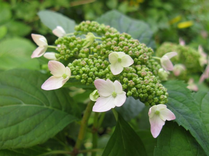 Vorhin hab ich gesehen, dass unsere noch sehr kleine Kletterhortensie blüht - zum ersten Mal überhaupt
