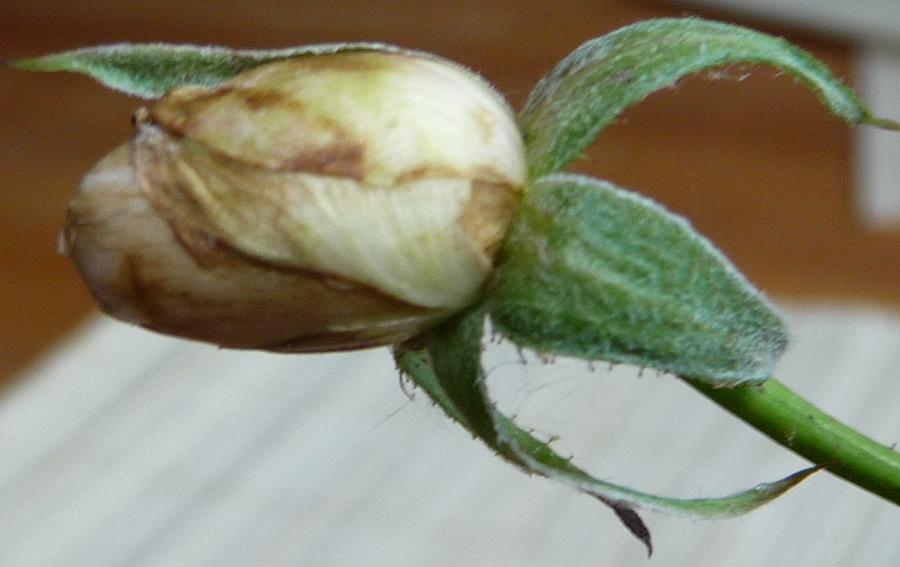 es sind ja auch nicht alle Blätter krank...hier siehst Du noch gut, daß sie bis kurz vorm Abblühen innen so "perlig" bleibt.Da sie nun so in Schnupperhöhe stand: Örks, nee zur Zeit nicht mein Geschmack, ich vermute es ist das, was man Myrrheduft nennt, viele englische helle haben es auch...