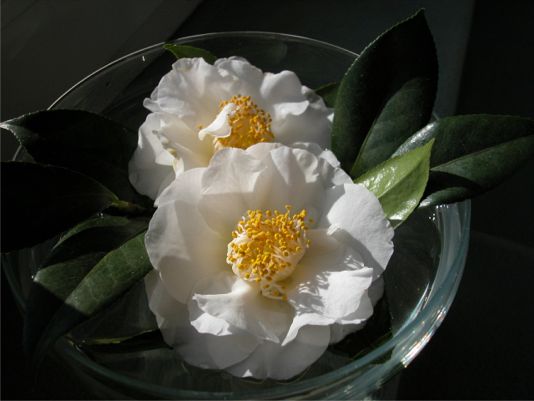 @Pumpot,im nächsten Jahr werde ich auf jeden Fall nach Zuschendorf fahren, um mir die Kamelienausstellung anzusehen. Ich war schon einmal vor 8 Jahren dort, und mehrere Leute haben mir erzählt, dass die Ausstellung noch schöner und interessanter geworden sein soll.@alle,da meine Topfkamelien bei dieser Kälte auf unserem Boden unter dem Dachfenster stehen und ich sie dort nur sehe, wenn ich sie pflege, schneide ich die Blüten ab und gebe sie in eine Schwimmschale.Dies ist 'Shiro Botan':