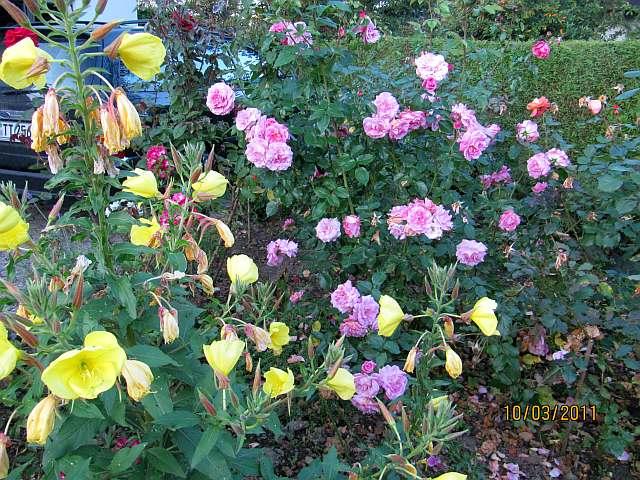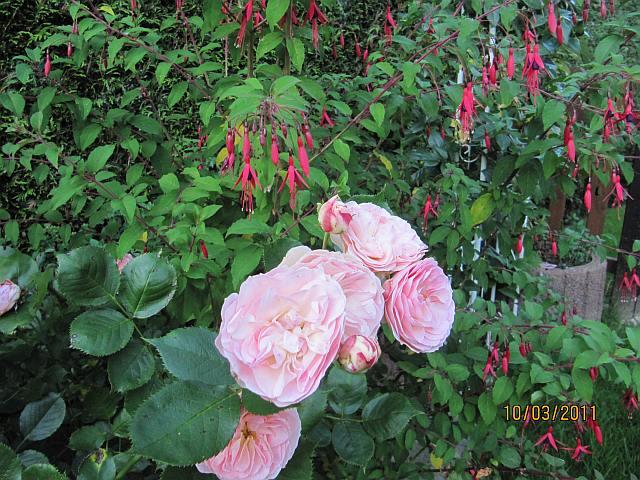 Viel Tau haben wir auch, das dürfte die Rosen hier nicht stören. Erstmals öffnen sich auch die Knospen der Red Eden Rose, die bei Regen immer verkleben.Ansonsten im Osten nix Neues: es blühen noch immer Tradescant, Alan Titchmarsh, Red Eden (Foto 1), Bonica (mit Sommerflieder am 2. Bild), Schneewittchen etc. Auch Mutabilis setzt auch gerade zu einem neuen Schub an - unglaublich, wo sie doch im Winter oberirdisch abfror.