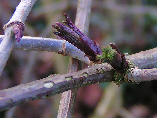 Ich habe letztes Jahr zum allerersten Mal Kornelkirschen gegessen, die im Kreislehrgarten einfach so auf dem Boden lagen. Superlecker! Gar nicht mal so sauer, vielleicht weil sie überreif waren.Kornelkirschen werden je älter, je schöner von der charaktervollen Rinde. Sehr auffallend finde ich jetzt (Foto beinahe 1 Woche alt) den vorwitzigen Austrieb vom Holunder, der hier im Garten Narrenfreiheit hat.