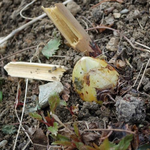 Seit einigen Tagen rätsle ich über diesen Austrieb. Eine Primel? Aber ausgerechnet an der wärmsten und trockensten Stelle! Heute kam mir die Erleuchtung. Es istOstrowskia magnifica.2010 gepflanzt, 2011 überhaupt nicht ausgetrieben und für eingegangen gehalten. Das entschädigt doch für den einen oder anderen Verlust über den Winter.
