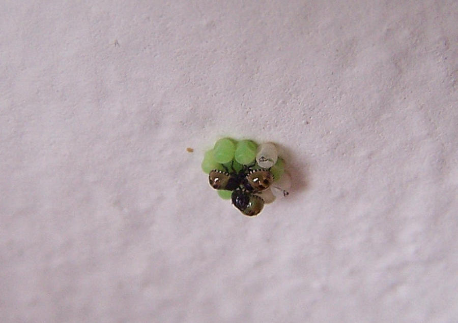 Sieht mir eher nach Kohlwanzen (Eurydema oleraceum) aus. Die Eigelege sind sehr ähnlich.Habe seit kurzem ein neongrünes Eigelege an unserer Hauswand entdeckt. Konnte im Internet aber auch nur Fragen zu den Gelegen finden, aber nicht wer da schlüpft. Seit heute weiß ich mehr. Vermutlich sind es Nachkommen der Grünen Stinkwanze (Wanzen haben wir hier viele verschiedene). Bei der Thüringer Landesanstalt für Landwirtschaft ist das Eigelege mit abgebildet. http://www.tll.de/ainfo/pdf/wanz0311.pdfEin recht gutes Bild der Larven ist hier zu sehen: http://www.naturspaziergang.de/Wanzen/P ... rasina.htm
