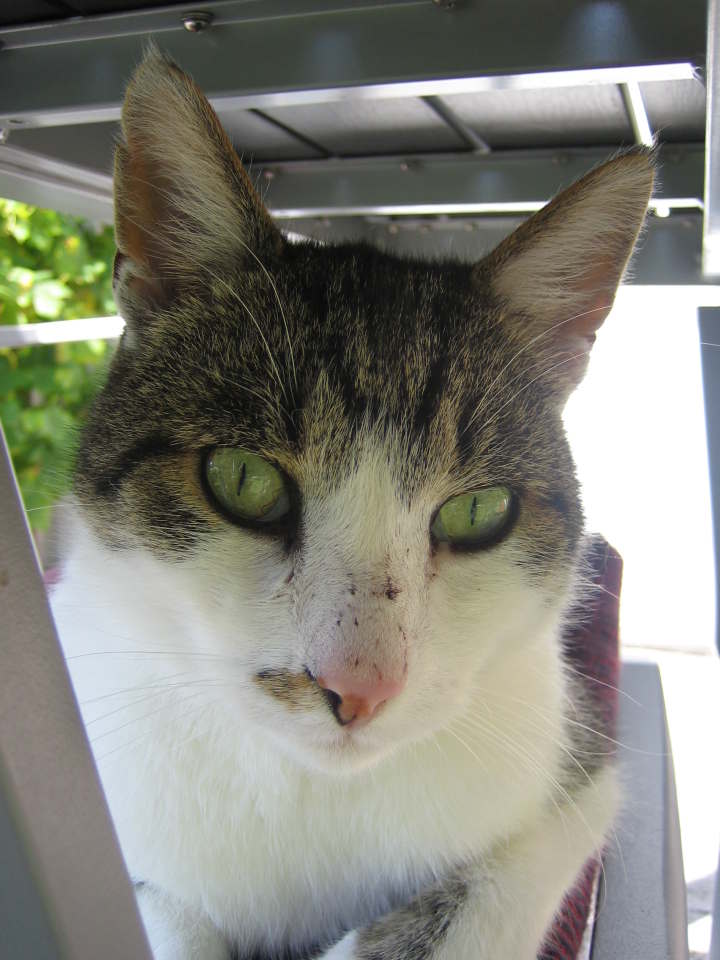 Heute zur Abendessenzeit:Für meinen Mann und mich hätten zwei Gartenstühle mit zwei Auflagen genügt, aber Nelchen war schneller. Also noch einen Stuhl aufstellen und die Lady gaaanz vorsichtig samt Stuhl ein wenig zur Seite rücken: