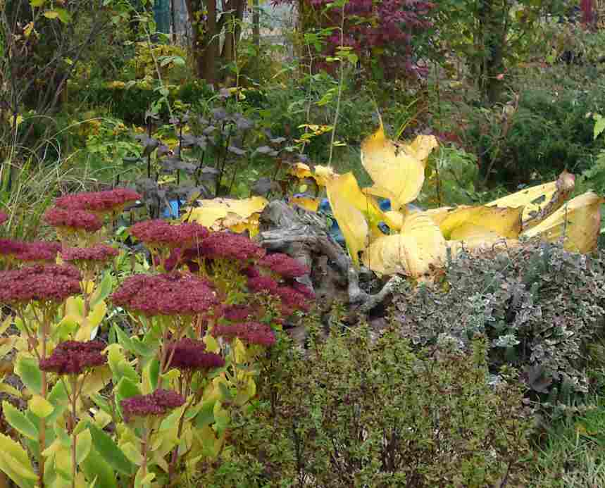 Da hätte ich ein passendes Bildchen (nur wegen der Farben, nicht der Bildqualität. Die blaue Plane im Hintergrund bitte wegdenken)Die Hohe Fetthenne wäre vielleicht auch etwas.Wäre Phlomis russeliana zu gelb?Von den beiden letzten könnte ich Dir im Bedarfsfall im Frühjahr was zukommen lassen.Ich verliere ständig aus den Augen, dass Du lehmigen Boden hast, mit dem ich so gar keine Erfahrung habe. Ich bitte also um Verzeihung, falls ich auch Pflanzen nenne, die dafür nicht gut geeignet sind."Sum and Substance" z.b.