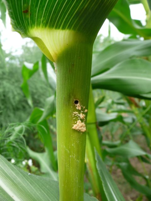 Mais gibt es in meinem Gemüsegarten seit vier, fünf Jahren. Mit Schädlingen hatte ich bisher nie zu tun. Dieses Jahr hab ich zum ersten Mal Probleme mit Maiszünslern , obwohl es weit und breit keine Landwirtschaft und entsprechend keine Maisfelder gibt. Dieses Loch fiel mir zuerst auf.