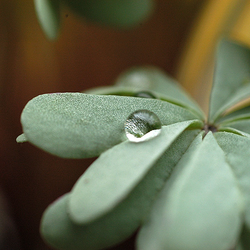 Wenn man Tropfen nah genug im Fokus hat, dann fragt man sich, wo man scharf stellen soll.Hier liegt die Schärfe am Tropfengrund, man sieht die Blattstrukturen, auf denen der Tropfen hängt ... und durch die er teilweise aufgenommen wird.