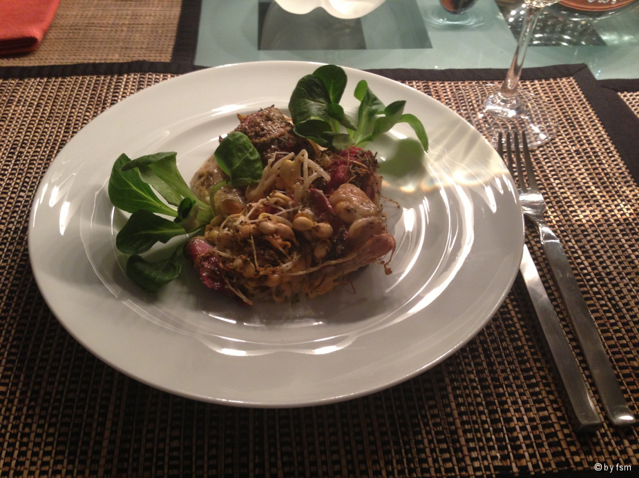"Reste" meines Kuehlschrankinhalts" waren italienische Bratwuerste, Baby-Shitake, Mortadella, Knofi, Zwiebeln, Mungosprossen, Chicoree mit Sahne und viel Oregano auf Toastbrotunterlage zum Auflauf zusammengehäuft!Die zweite Portion ist gerade weg!LG Frank