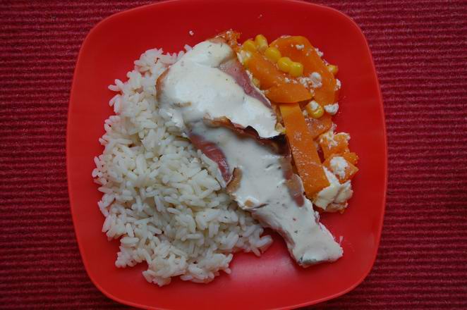 . Nein, ich zügel mich noch etwas und warte auf den December. Jetzt ist erst mal Kürbiszeit. Oder so.Zum Mittag gab es Forelle im Speckhemd, dazu Kürbis-Mais-Gemüse und Kaffirlimettenreis.