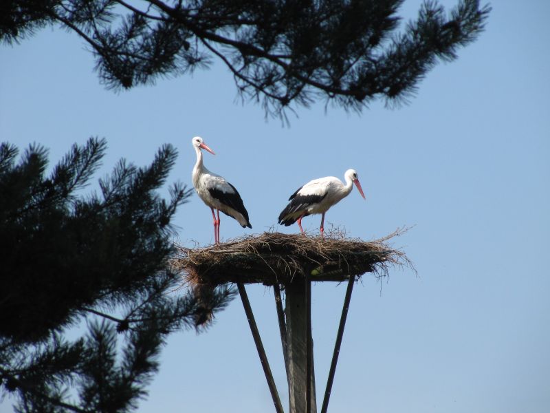 Mir wäre dieses Jahr fast was entgangen - fast!Hinterm Garten gibt es eine kleine (drei- oder vierreihige) Kiefernschonung, am meinem Garten zugewandten Ende steht seit Jahren eine Art Mast mit einem Wagenrad darauf. Jedes Jahr legt der Besitzer oder Pächter Zweige drauf, jedes Jahr ist nach den ersten Herbststürmen das Rad nackt und bloß. Die ersten Jahre bin ich oft zum Zaun gelaufen, um zu sehen, ob sich da was tut- immer vergebens.Dieses Jahr vernahm ich durch das Kranichgeschrei (stehen häufig auf der Wiese hinterm Garten) und dem vergeblichen Hoffen auf den Ruf des Wiedehopfes des öfteren Geklapper. Das war nichts Neues, schließlich brüten Störche auf dem Kirchturm. Gestern abend drang so langsam in mein Hirn, dass das Geklapper irgendwie aus der falschen Richtung kam. Es kam von da hinten.