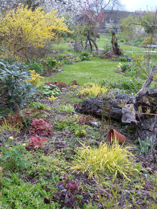 Da ist ja noch Platz ! Hosta "Laterna Magica" würde gut passen , niedrig , gelbes Laub tiefviolette Blüte , gut bodendeckend . Hier stehen noch zwei Pötte rum