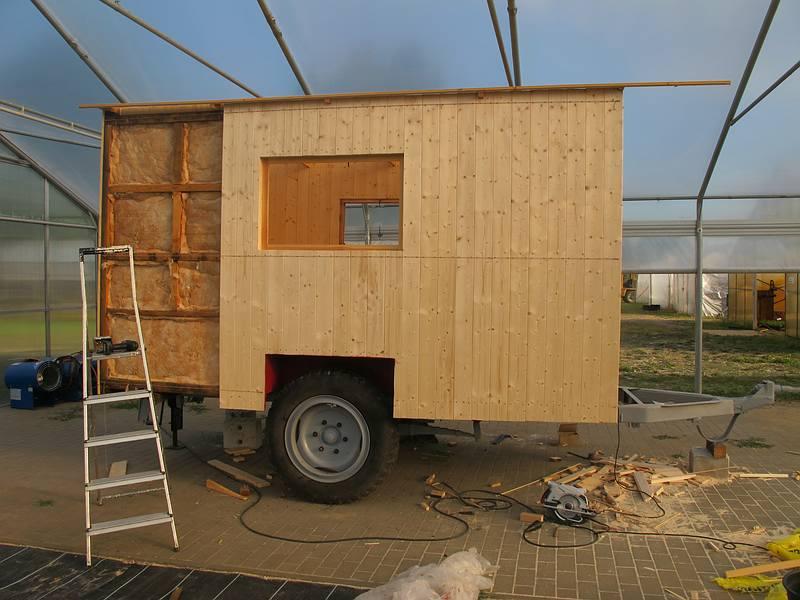 Das Lattengestell verschale ich von innen und von außen mit Brettern. Dazwischen kommt Glaswolle, um den Bauwagen etwas zu isolieren und vor allem winddicht zu machen. Heute Abend werde ich wohl die dritte Außenseite fertig bekommen. Dann fehlen noch Vorderseite, Dach, Fußboden und allerlei Kleinkram.