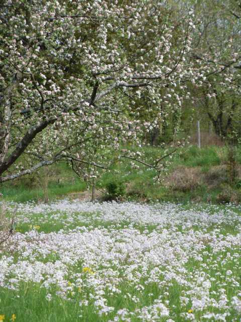 Ich finde, bis jetzt klappt der Spagat zwischen Rasen und Wiese ganz gut. Die Wiese muss nebenbei auch noch von einem Traktor befahren werden können.Wichtig scheinen die Inseln zu sein, in denen sich die Blumen aussamen können und in denen sich Tiere zurückziehen können.Und dass man nicht zu oft mäht, das kommt mir eh entgegen, da ich nicht gerne mähe. So wird erst gemäht, wenn das Gras so 15-20 cm hoch ist und es der Mäher gerade noch schafft.Hier nochmal Wiesenschaumkraut unter Gravensteiner....Hach, Frühling