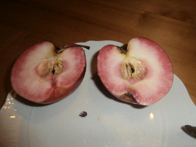 Das mit der Aroniabeere würde in der Führung extra mehrfach betont.Das mit der Aroniabeere kann ich nicht so recht glauben. Ich dachte, es sei dieser rotfleischige Wildapfel "Niedzwetskyana", von dem die ihre rote Farbe haben. Biologen - Pomologen, ihr seid gefragt.Alle haben sie die Gene vom Roten Mond in sich und der entstand aus Apfel und Aroniabeere.