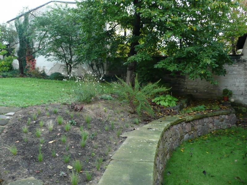 Ich hätte noch ein Beispiel für eine flächige Pflanzung von Stipa tenuissima aus dem eigenen Garten, die bisher so funktioniert, wie ich mir das vorgestellt hatte.Am Hang hinter dem Haus steht reiner Sand an, vermischt mit sehr viel Bauschutt (Hinterlassenschaft der Vorgänger). Außer Quecke wuchs da fast nichts. Das Bild entstand kurz nach Fertigstellung der Trockenmauer, die den Hang abfangen soll.