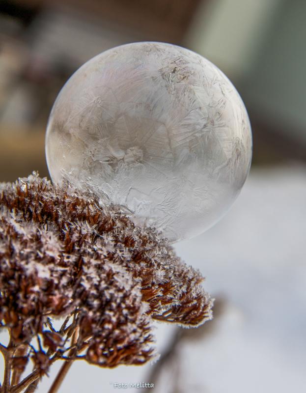 Eine gefrostete Seifenblase habe ich noch nie gesehen, weiß also nicht wie sie aussieht, wenn sie perfekt ist. Diese finde ich aber Klasse und ich kann mir vorstellen, dass sie sonnendurchleuchtet phantastisch aussieht. Man kann nicht alles haben.