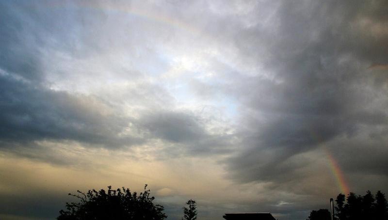 Eben goss es in Strömen, und dann kam nochmal die Sonne raus. Es reichte genau, um sich ins Auto zu setzen und die 500 m zum nächsten freien Aussichtspunkt zu fahren.Aufgenommen mit einem 14-24-mm-Weitwinkelzoom, um den Regenbogen komplett draufzukriegen.Wenn man ein bisschen genauer hinschaut, sieht man, dass die Regentropfen auf der Frontlinse zu ein paar unschönen Flecken geführt haben.