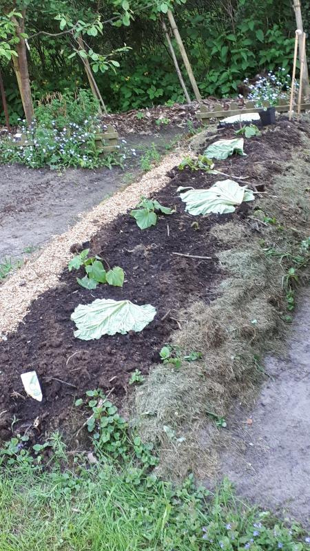 Die drei Pflanzen sind gekaufte "Naschgurke" stand drauf, müsste ne Salatgurke sein. Und dazwischen habe ich noch je drei Nester gelegt. vorgebirgstraube, Klostergurke und noch eine andere, deren Namen ich nicht parat habe. Gestern auf dem Treffen bei Sandbiene, habe ich auch noch eine Pflanze von Bastelkönig bekommen.