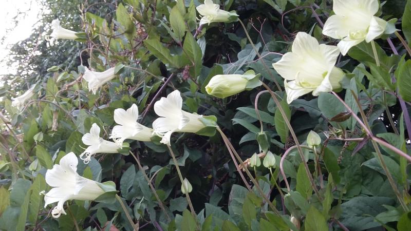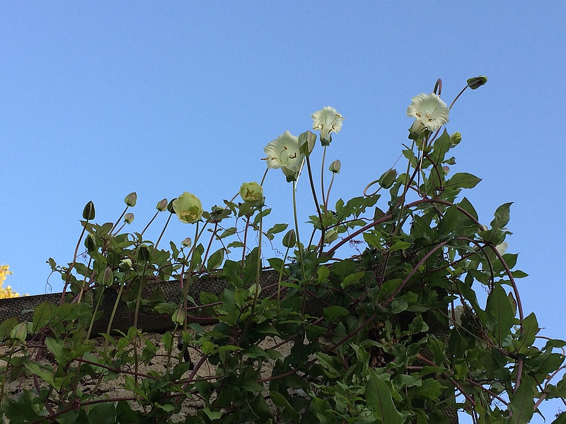 Seit Anfang Oktober blüht meine Cobea pringlei. Sie steht knapp 2 Meter vom Stamm einer Eibe, die ich pilzförmig schneiden lasse, entfernt.