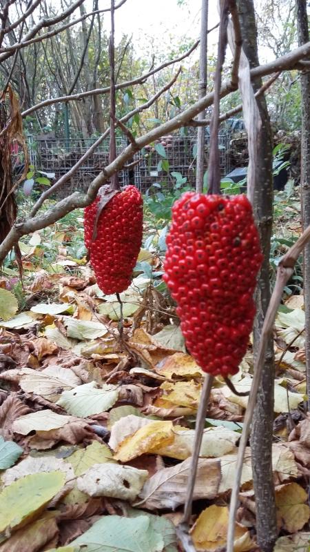 ok, keine Blüte, aber auch nett: die Früchte der Arisaema ciliatum sind nach dem Zusammenfallen der Pflanzen in den Zweigen hängengeblieben und baumeln herum.