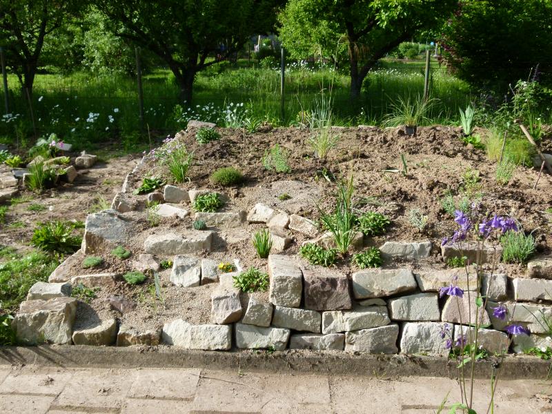 Das große Hochbeet nimmt langsam Gestalt an. Die vordere Ecke habe ich nicht konsequent eckig gehalten, sondern als Mini-Steingarten vorgesehen für kleinere Pflanzen.