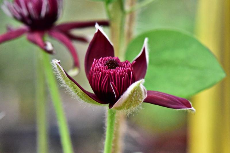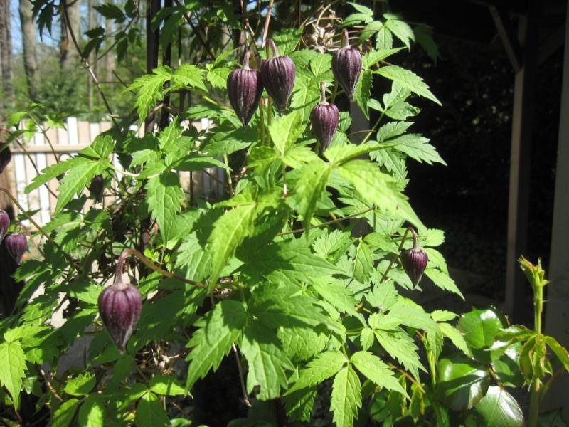 Die Knospen von Clematis hancockiana oeffnen sich.