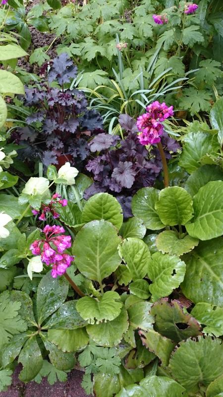 Mir ist es leider nicht gelungen, die etwas dunkler belaubten Bergenien mit aufs Bild zu kriegen, die sind in der Kombi noch hübscher. Da ist es aber einfach zu dunkel für die Handykamera. Auch die Heuchera sind im Topf dazugestellt - den Bereich will ich ausdehnen.