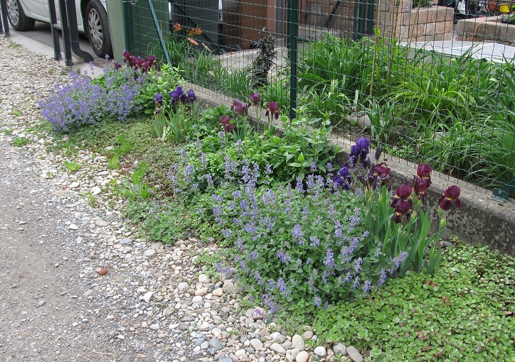 Das 'wilde Beet' am Straßenrand mit blauer Katzenminze und zwei unbekannten alten Iris-Sorten ist gerade auch ein echter Hingucker: