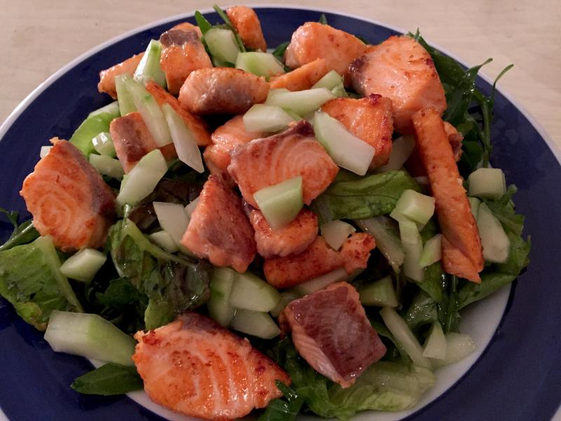 hier gartensalat mit lachs. da pinienkerne aus waren, gab es gartengurke dazu. >:(
