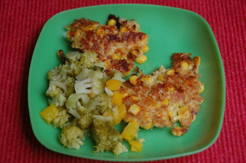 Hier sollte es Grünkern-Mais-Feta-Bratlinge mit Broccoli und Paprika geben. Da aber die Bratlinge ständig auseinander fielen und mir die Takis keine halbe Minute Zeit am Stück gönnten, um der Ursache nachzugehen und das zu ändern, gab es gebratenen Grünkern-Mais-Feta-Pamps >:(. Zwei Stück konnte ich irgendwie halbwegs retten :) ...