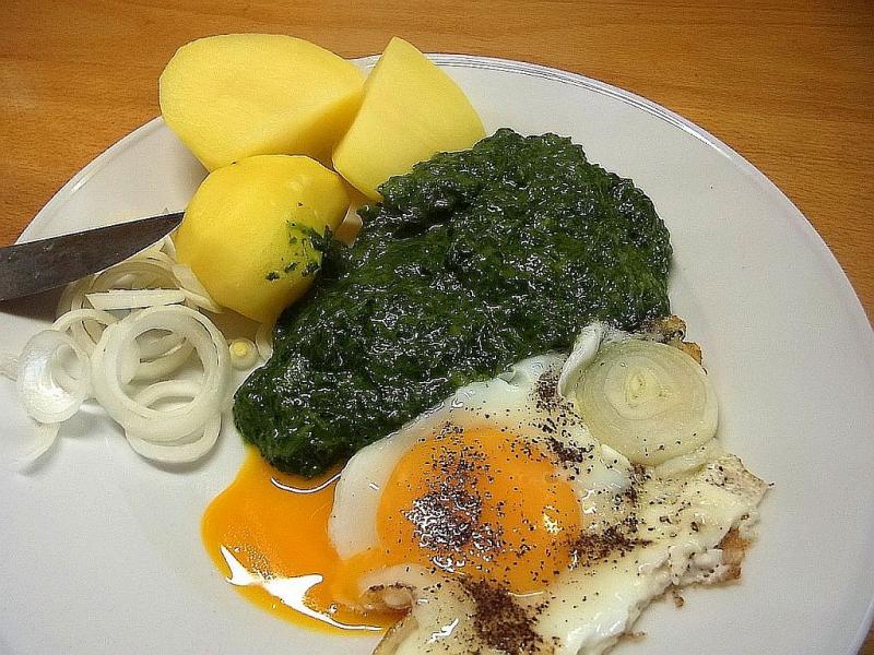 Salzkartoffeln und Spinat mit einem (ausgelaufenen) Spiegelei. ;)