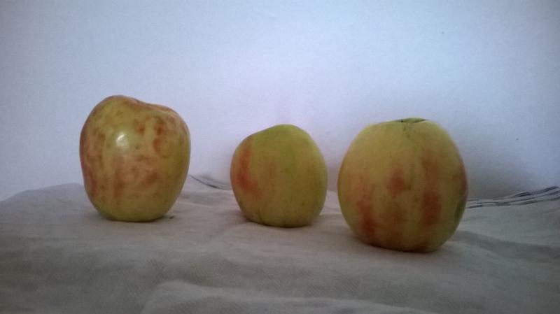 Tja, meine eigenen Äpfel sind zumindest ähnlich, Kelchblätter und Stiel ähneln sehr denen meiner Äpfel. - bis auf das Kernhaus, was vielleicht auch mal ein Ausreisser einer Frucht war. Der Rest an Unterschieden ließe sich erklären: Anderer Typ - weniger glatte Schale, Unterschiede in Farbe und Zeichnung. Weniger Duft infolge anderen Reifezustands (hätte meine Selbstgeernteten lagern müssen) und ebenfalls durch Typ, Unterlage und Herkunft.
