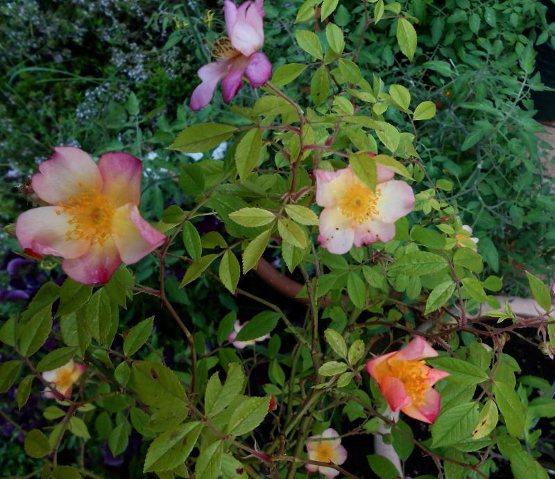 Wesentlich robuster ist die Plaisanterie, in der ist zur Hälfte die Mutabilis vertreten, das Farbspiel der einfachen Blüten ist ähnlich.
