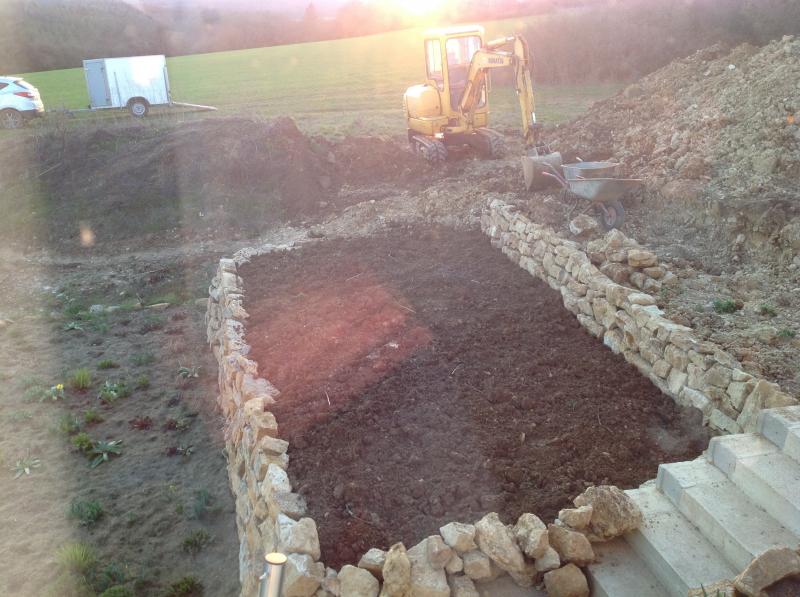 Los geht es! Baggern für die zweite terrassierung und den Rest der Bodenangleichung.... Und Gemüsegarten ... Und birnenspalier etc.