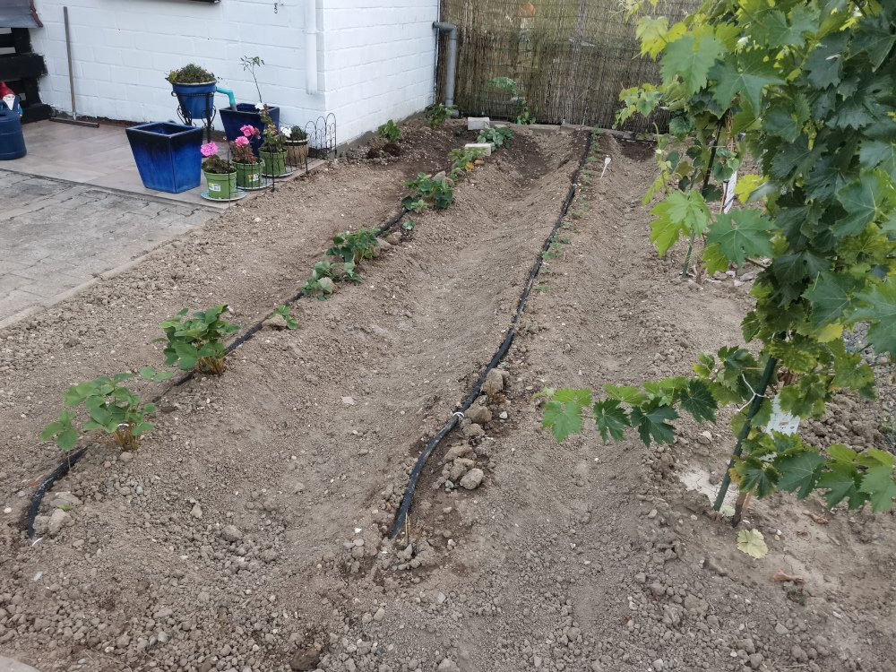 Hier wurden Erdbeeren auf Damm gepflanzt, Tropfbewässerung gleich mit verlegt. Rechts der erste Meter ist kurz nach dem pflanzen noch im Spätsommer vertrocknet. Eine Tropfbewässerung funktioniert nur, wenn es auch Wurzeln gibt. Überkronenberegnung zum anwachsen hat da schon Vorteile.