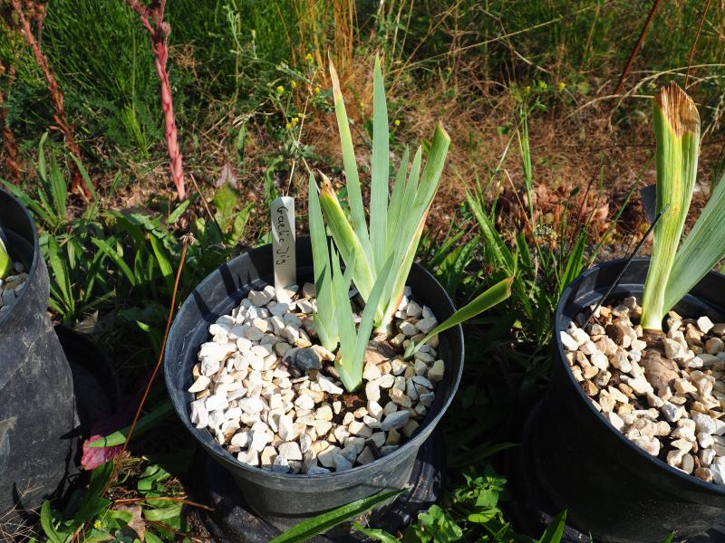 von Iris IB 'Tumwater' konnte ich ein paar Rhizome retten. Die Sorte habe ich schon lange, schätze ich sehr und freue mich, dass aus einem ganz verschrumpelten Dingelchen von Rhizom jetzt zwei kleine Fächer sprießen.