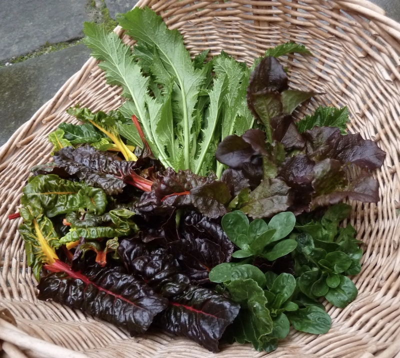 Nicht heute, gestern: Überwinterte Herbstrübchen, Mangold, Spinat und kleine Salatpflänzchen von Amerikanischer Brauner Pflücksalat. Wächst wie Unkraut. ;)