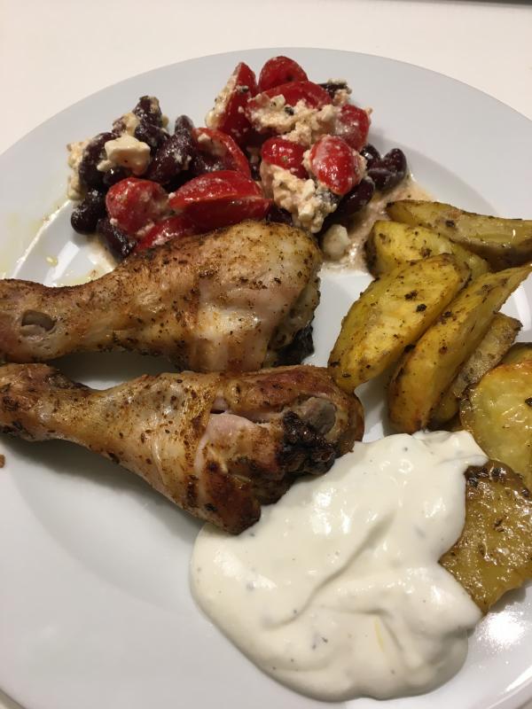 Hier die letzten Tage Hähnchen und Kartoffeln aus dem Ofen mit Tzatziki und Salat