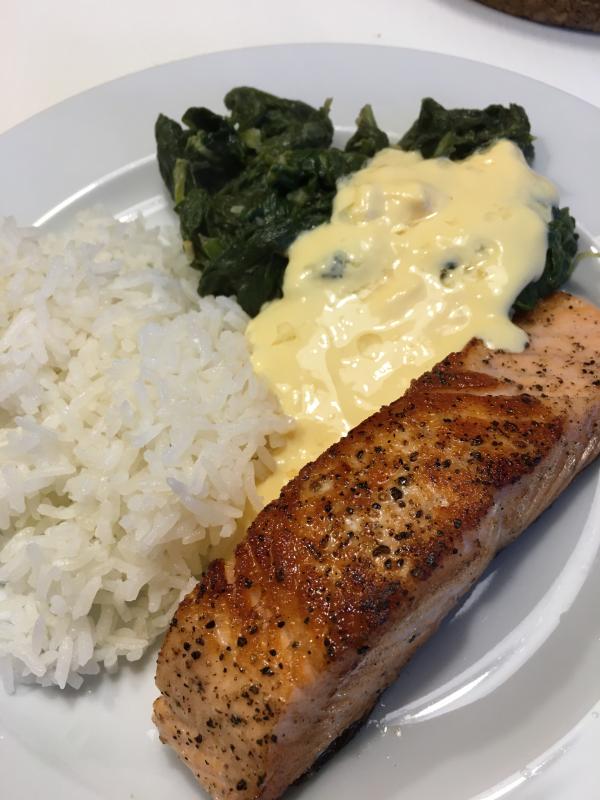 Lachs mit Reis, Neuseeländer Spinat aus dem TK Vorrat und Zitronensoße. Eigentlich sollte es Spinatrisotto dazu geben...Risottoreis war leer :(