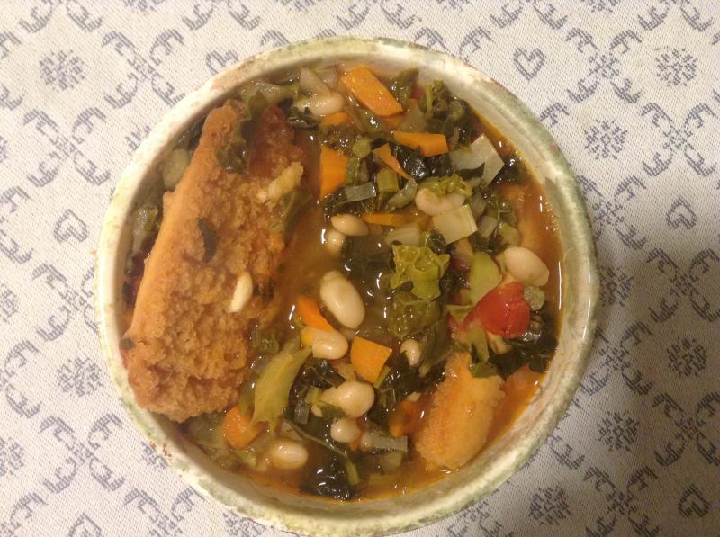 Heute habe ich vorgekocht: ribollita in großer Menge, eine Suppe aus Palmkohl, Wirsing, Mangold, Cannellini-Bohnen, Karotte, Staudensellerie und Dosentomaten. Schmeckt am nächsten Tag genauso gut, manche sagen sogar besser.
