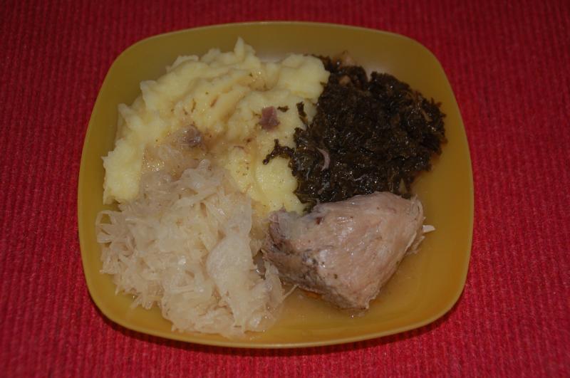 Kartoffelbrei (mit Sahne und Muskat) mit Sauerkraut, Grünkohl und den mageren Fleischstücken vom Eisbein