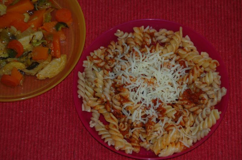 Essen 1: Spirelli (Vollkorn~ und "normal") mit Bolognesesauce (aus dem Glas) und Emmentaler