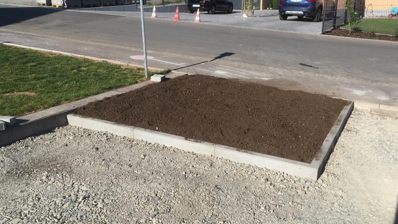 Man sieht zwar die deponierten Betonsteine, aber wäre es eine Überlegung wert, die rechte Seite um der zunehmenden Versiegelung von Flächen entgegenzuwirken, die eher nicht mit Autos befahren wird, mit Rasengittersteinen zu pflastern.