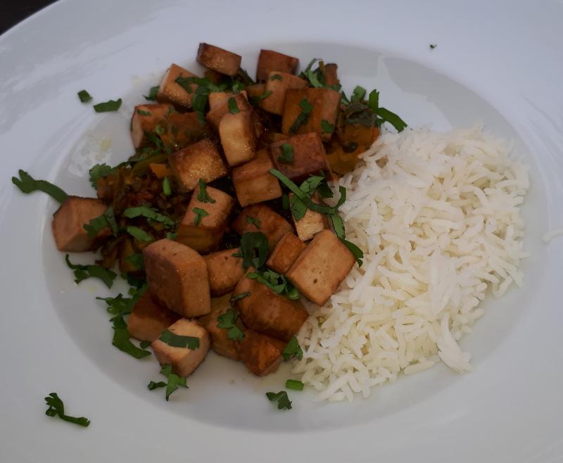 Heute gab es Basmati, Gemüsecurry und gebratenen Tofu, dazu Gartenromana