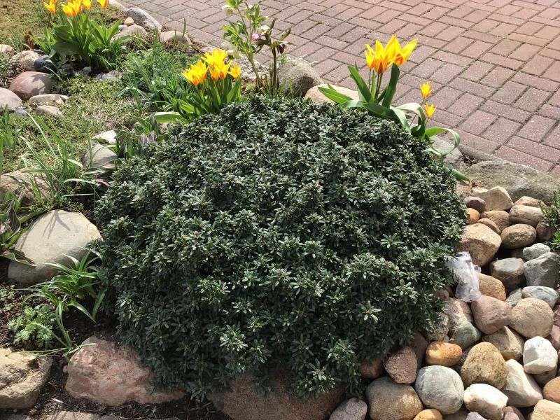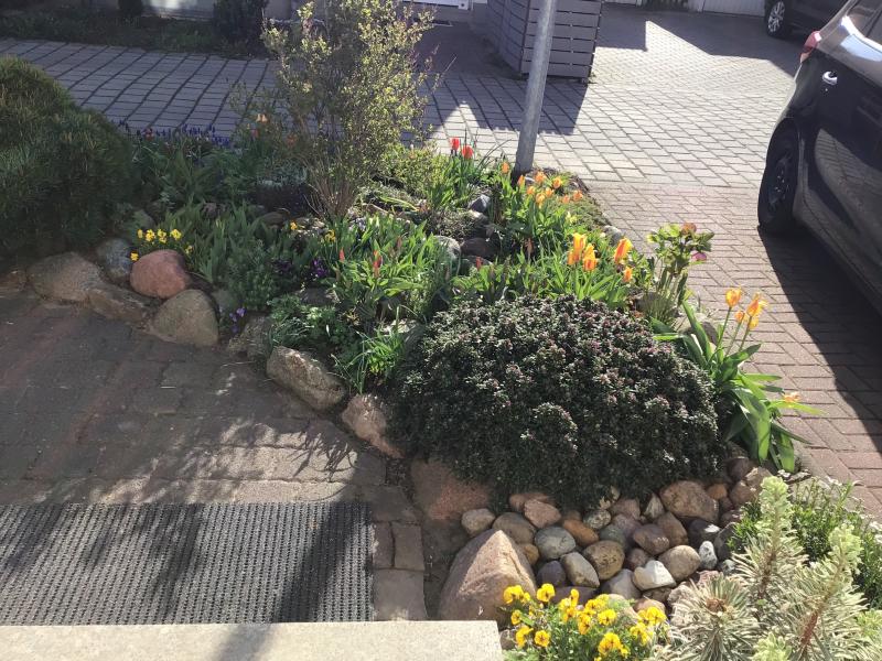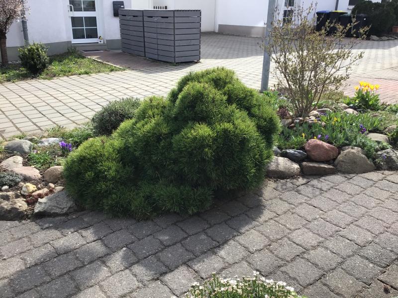 Ich möchte noch die beiden „Lieblingspflanzen“ meines Vorgartens vorstellen. Als erstes meine Zwergkiefer. Vor 25 Jahren hatte ich mal eine Bonsai Ausstellung besucht, war begeistert und wollte es auch versuchen. Die Zwergkiefer sollte ein Bonsai werden. Schnell musste ich feststellen, das ich die erforderliche Zeit aus beruflichen Gründen nicht aufbringen konnte. Als wir vor 22 Jahren in unser Reihenhaus zogen, zog die Kiefer mit und wurde in den Vorgarten gepflanzt. Ganz konnte ich aber nicht von der Gestaltung ablassen, wie man auf dem Foto sieht. Die zweite Pflanze ist ein Seidelbast Daphne xhendersonii Ernst Hauser. Die habe ich von rund 10 Jahren von Andreas Händel als winzige Jungpflanzen gekauft. Inzwischen hat sie einen Umfang von fast 250 cm und damit die prophezeite Größe überschritten. Zur Zeit steht die Blüte bevor in diesem Jahr etwas später als sonst.