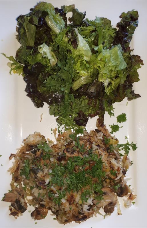 Gebratener Reis mit Champignons und Zwiebeln, dazu Gartensalat