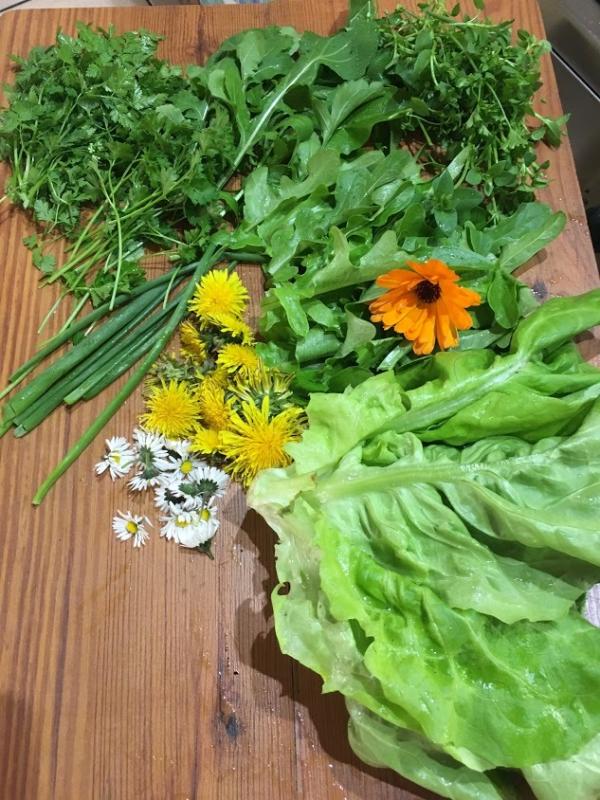 Heute habe ich etwas Postelein und Dill für den Salatteller geerntet und Petersilie und Schnittlauch für die Falafeln und einen noch kleinen Eichblattsalat.