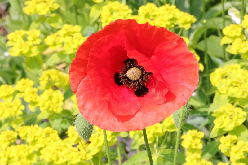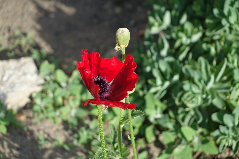 Zum Schluss noch ein bisschen Knalleffekt: ein Mohnsämling vor Euphorbia corallioides.