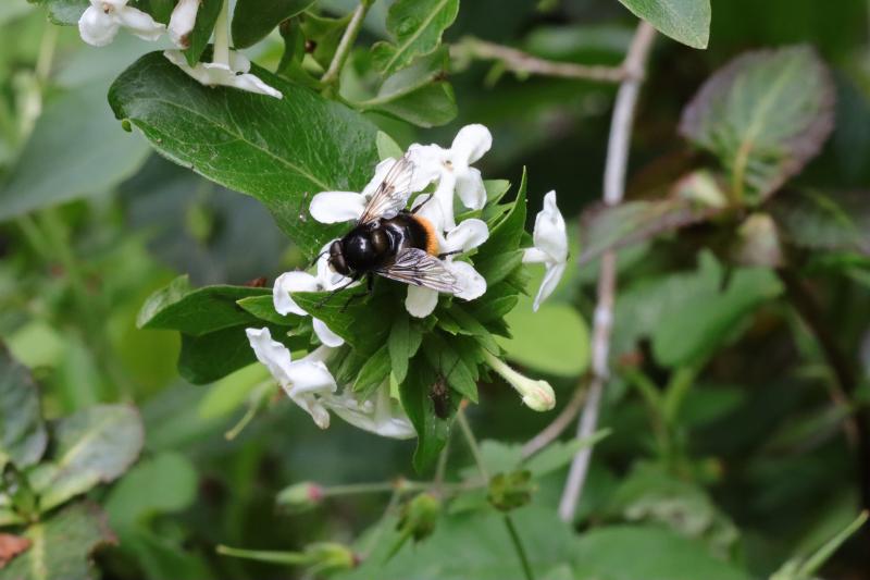 Abelia mosanensis wird als Bienenweide empfohlen, lockt offensichtlich aber auch andere Kandidaten an.